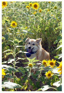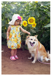 ひまわりと一緒に、愛犬の愛らしい姿を撮影します。